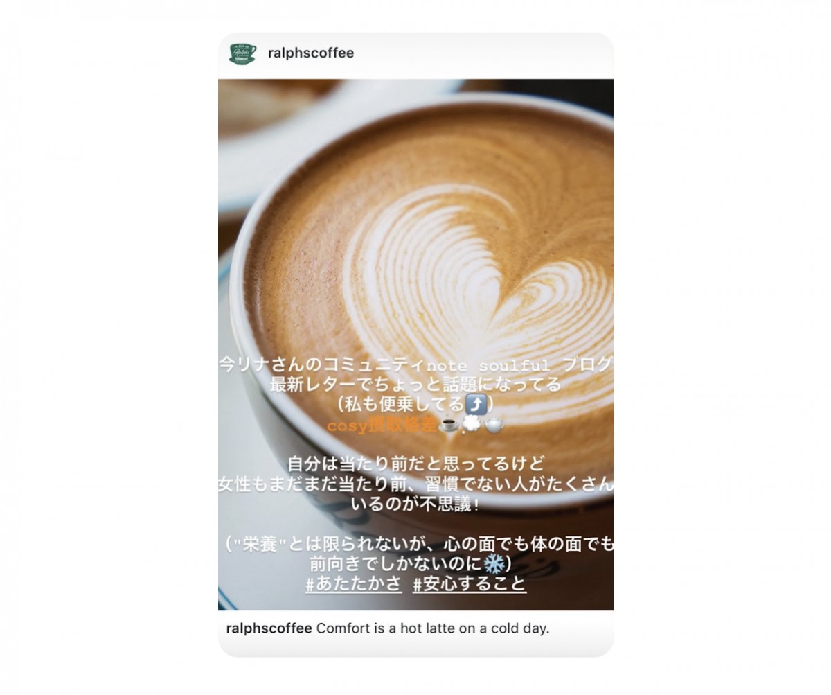 その時ちょうど目に入ったRalph's coffeeのメッセージがグッと来るcosyラテ投稿だったので、重ねてこんなつぶやきも投稿しちゃいました。(こういう便乗もよくあります)。